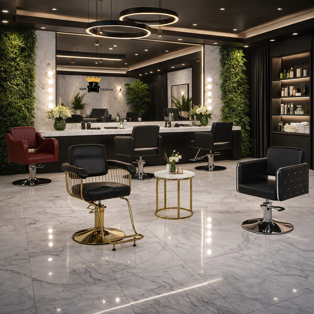 - Визуальная привлекательность и стиль. Каждое кресло задает тон. Например, кресло Комфорт Gold Lux с его блестящими подлокотниками-спицами и золотым основанием мгновенно создает акцент и атмосферу гламурной роскоши. Это выбор для салонов, делающих ставку на яркий, запоминающийся образ. В то же время кресло Рико в строгом черном цвете без лишних деталей говорит о сдержанной элегантности и минимализме, подходя для современных барбершопов или косметологических клиник. Эстетика мебели напрямую влияет на целевую аудиторию, притягивая именно ваших будущих клиентов.